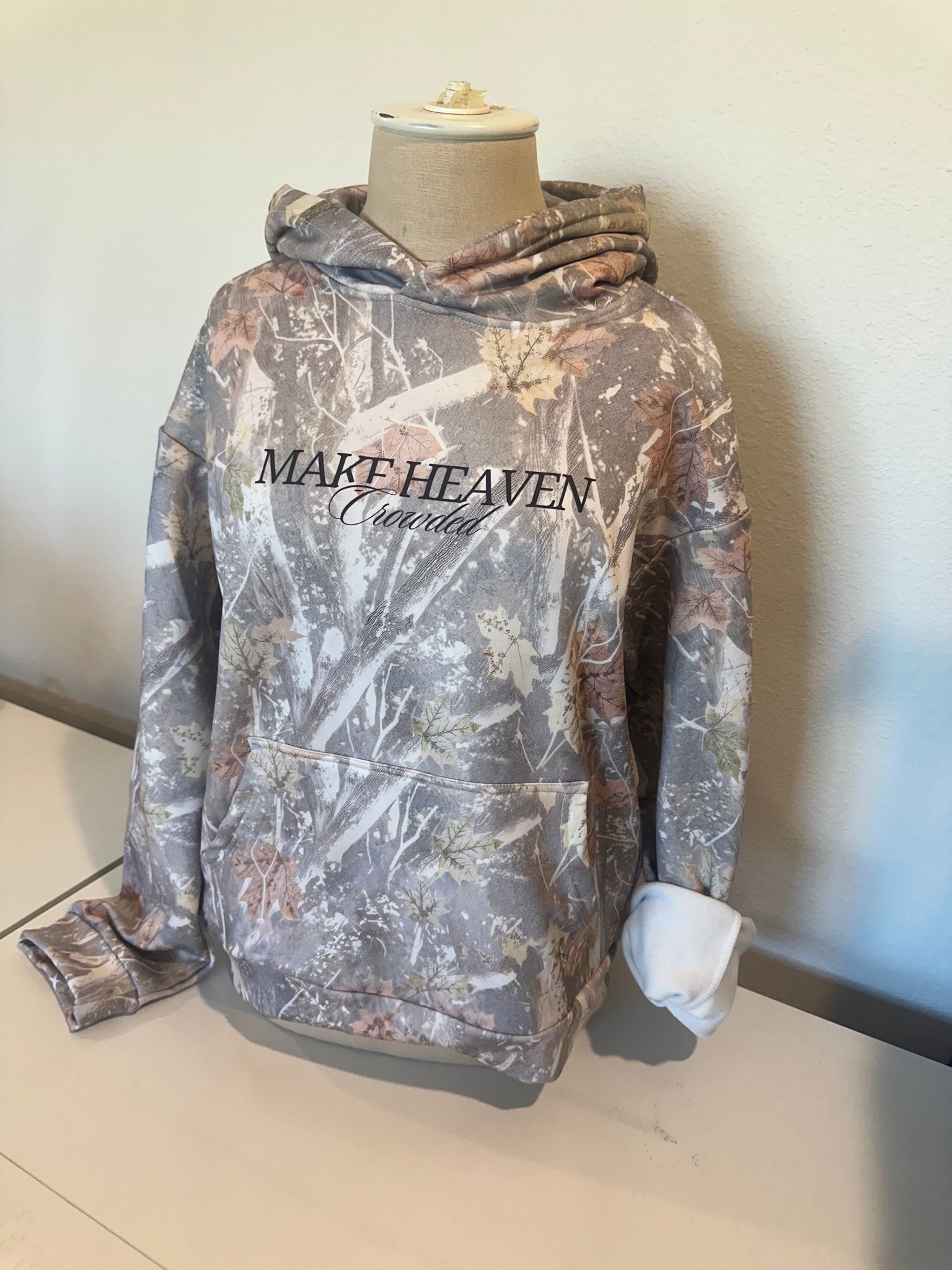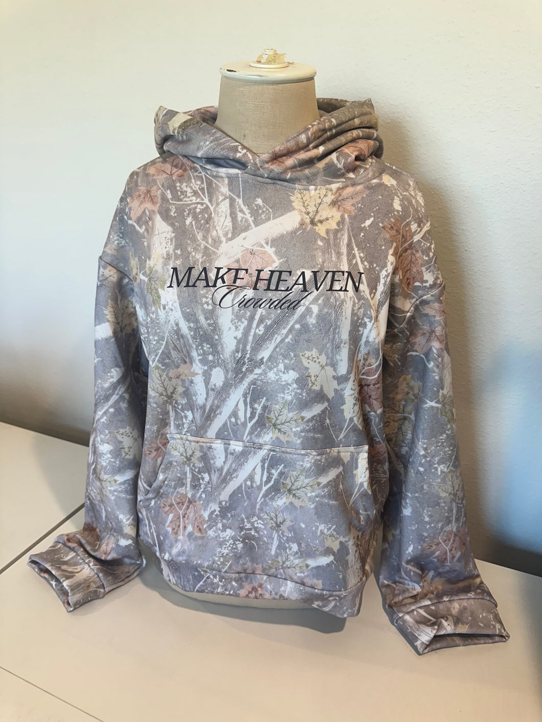 This is one of our "luxury items", meaning it comes in limited inventory. This camo hoodie has the message "Make Heaven Crowded" centered on the front.