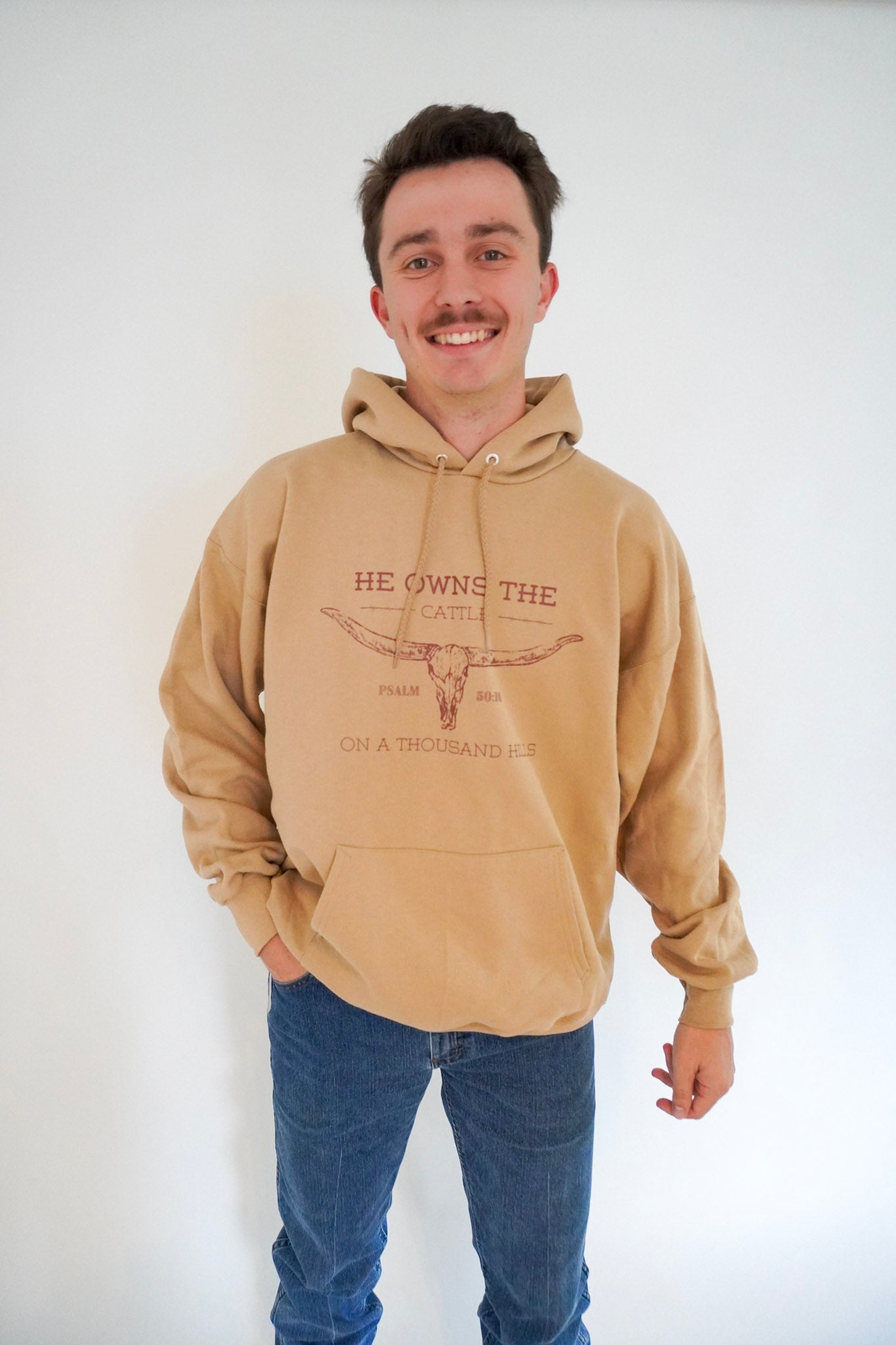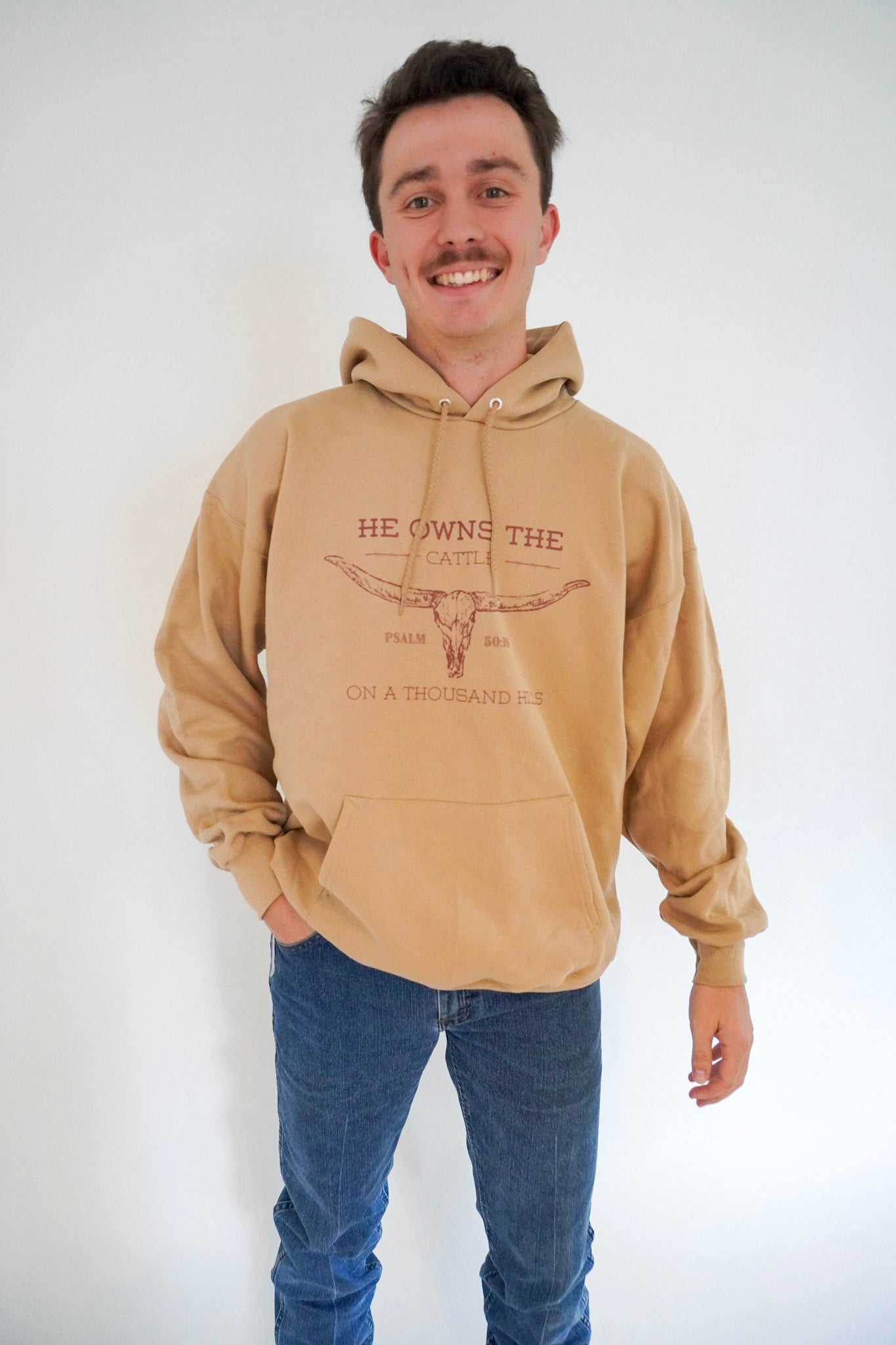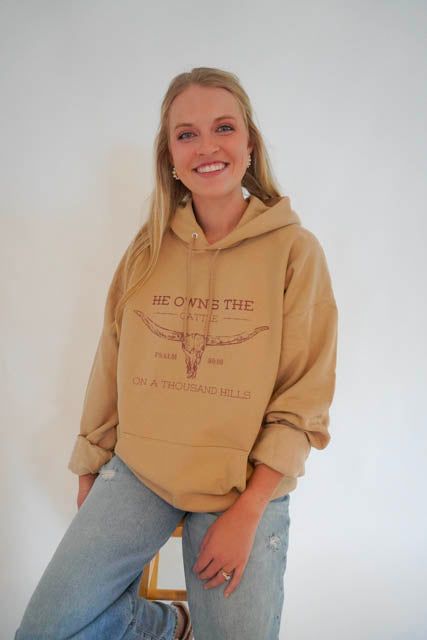 "He owns a the cattle on a thousand hills" printed largely on the front of a Hanes Pebble colored hoodie. This design emphasizes God's sovereignty and abundance while communicating His position as Creator and Owner of all creation.
