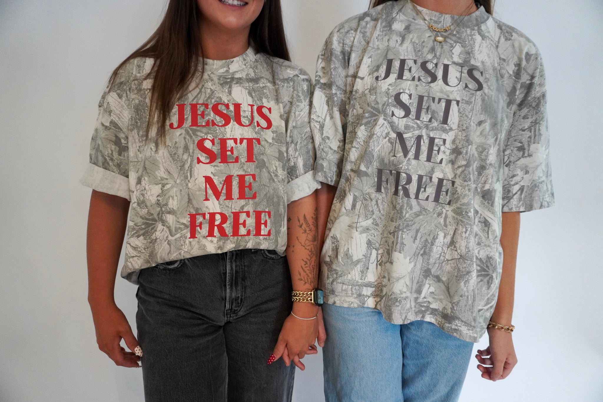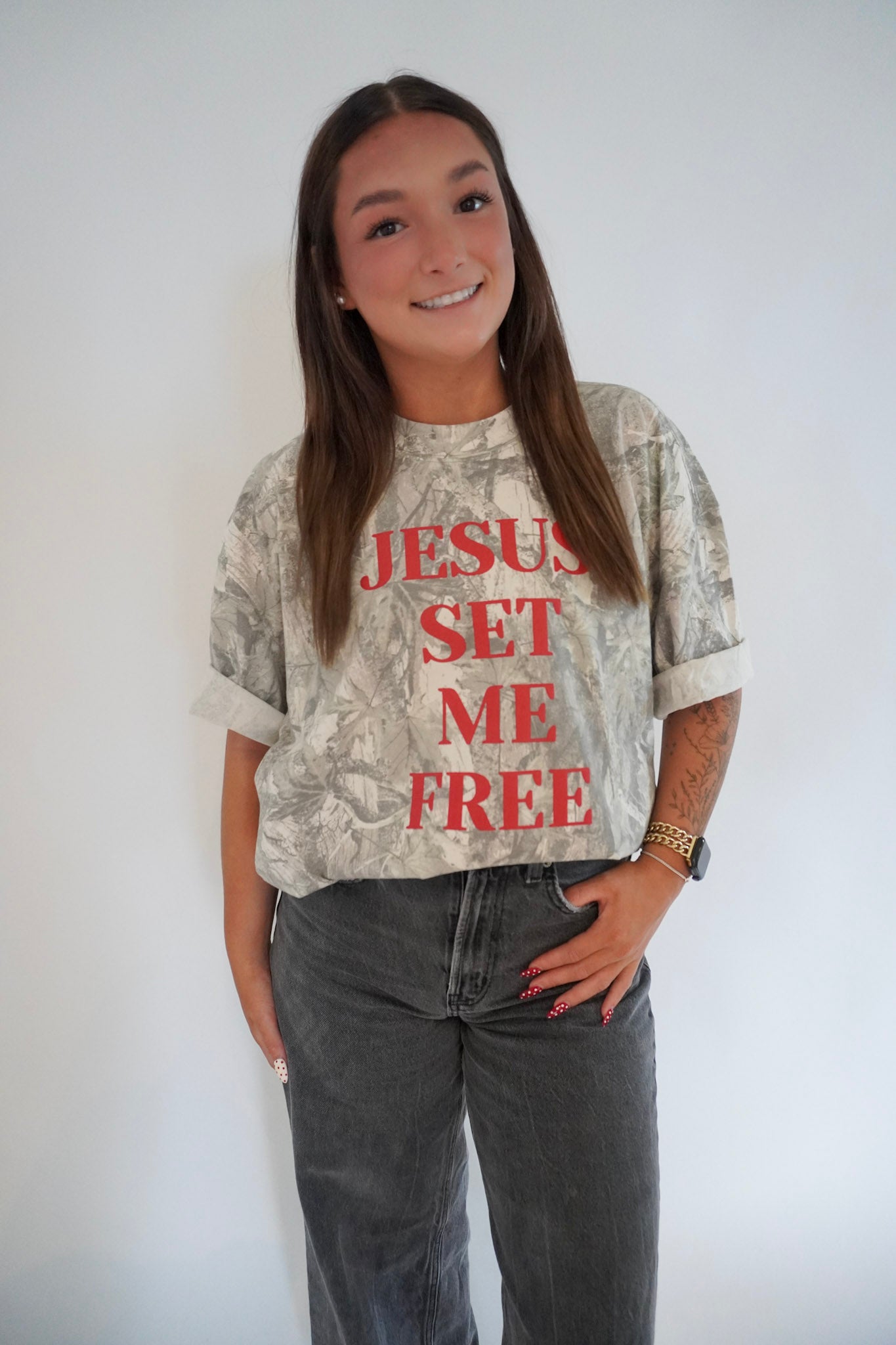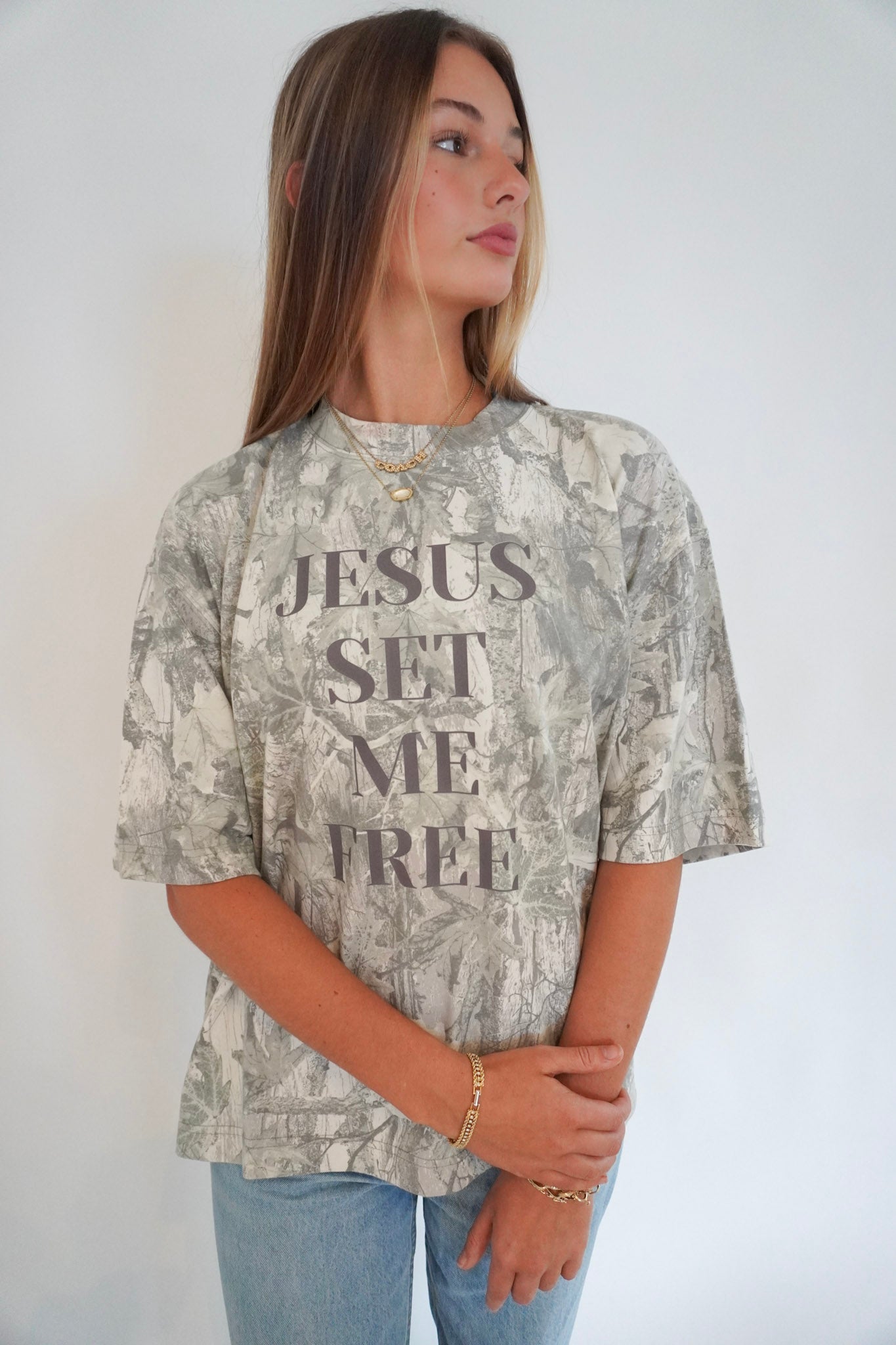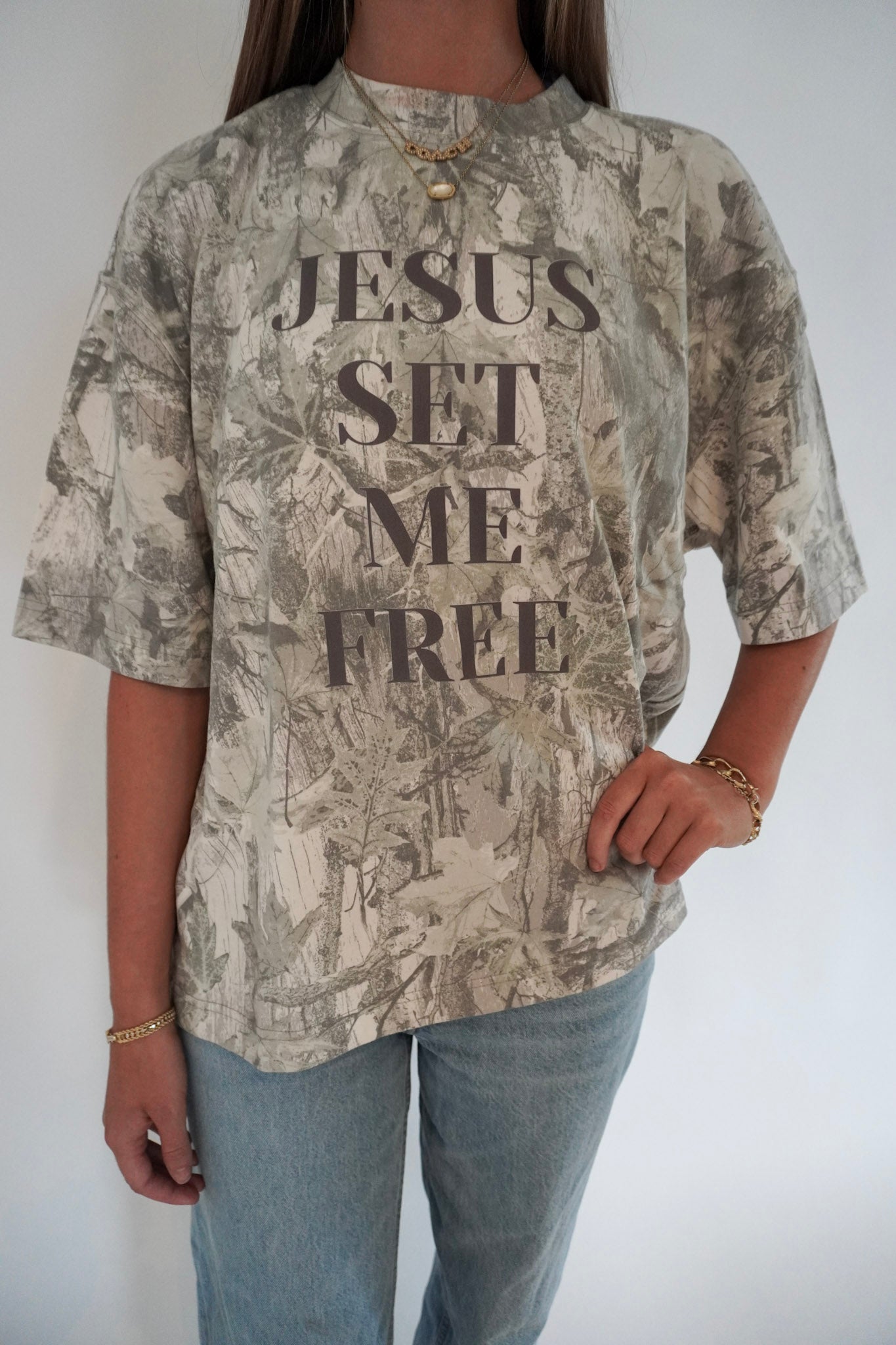 Step into freedom with our Jesus Set Me Free tee, a bold statement of faith and truth. This shirt features a subtle camo-inspired design with powerful lettering that declares the freedom we find in Christ.